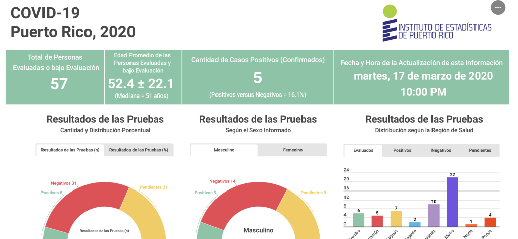 El Instituto de Estadística de Puerto Rico publicó un “dashboard” en línea con los números de casos sospechosos, confirmados y negativos. Incluye los datos demográficos. Al 17 de marzo: